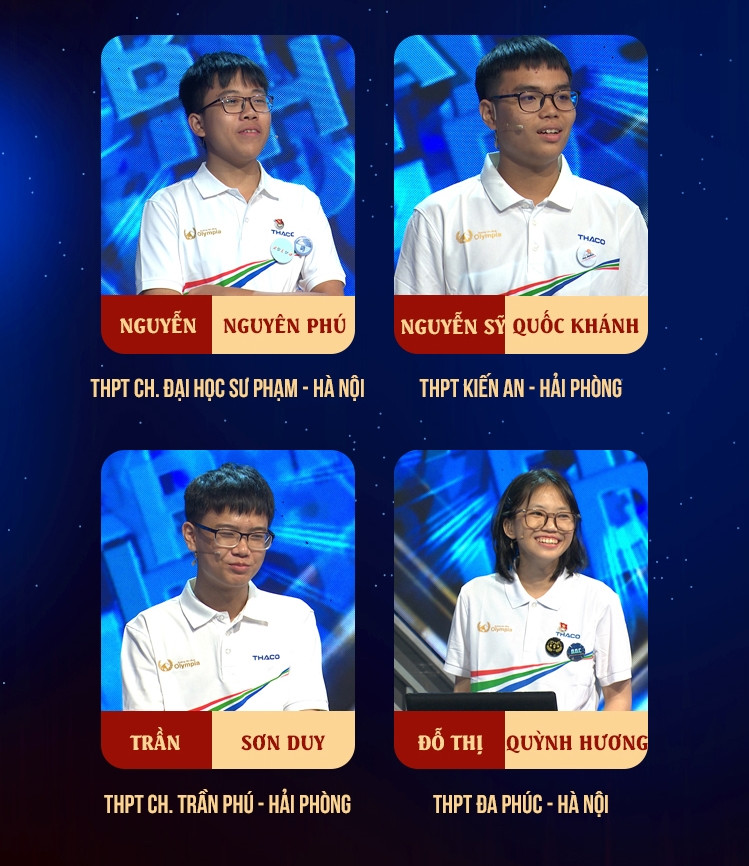 Trận thi quý 4 Đường lên đỉnh Olympia 2024 chính thức lên sóng lúc 13h ngày 6/10 là cuộc đấu trí ngang tài ngang sức của 4 nhà leo núi: Nguyễn Nguyên Phú (THPT Chuyên ĐH Sư phạm Hà Nội), Nguyễn Sỹ Quốc Khánh (THPT Kiến An - Hải Phòng), Trần Sơn Duy (THPT Chuyên Trần Phú - Hải Phòng) và Nguyễn Thị Quỳnh Hương (THPT Đa Phúc - Hà Nội).