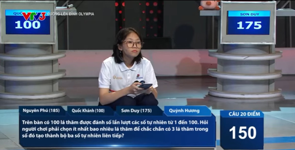 Trong lượt thi của Quốc Khánh, Quỳnh Hương đã bấm chuông 2 lần nhưng chỉ có 1 đáp án đúng, nữ sinh Hà Nội bị trừ 15 điểm rồi lại cộng thêm 20 điểm, san bằng điểm số 175 với Sơn Duy - người đang ở vị trí thứ 2.
