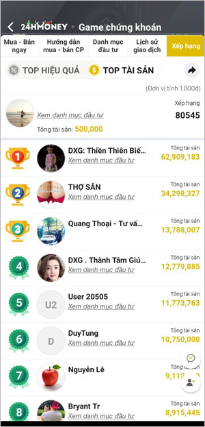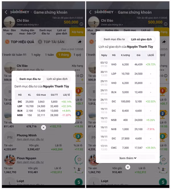 Trong bảng xếp hạng Top nhà đầu tư kiếm lời tốt nhất, bạn bấm vào dòng Xem danh mục đầu tư và Lịch sử giao dịch của người chơi. Từ đó bạn dễ dàng tìm hiểu được họ đang đầu tư cụ thể những mã cổ phiếu nào, phương pháp đầu tư của họ ra sao. Cách này cũng tương tự đầu tư theo các quỹ đầu tư lớn trên thị trường vì họ thường chọn cổ phiếu tốt và tăng trưởng mạnh.