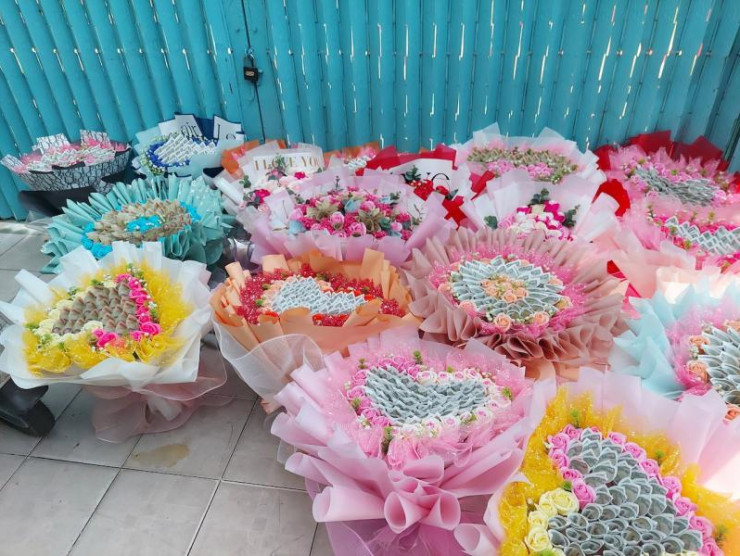 Các bó hoa cuốn từ tiền thật hút khách trong các ngày lễ.
