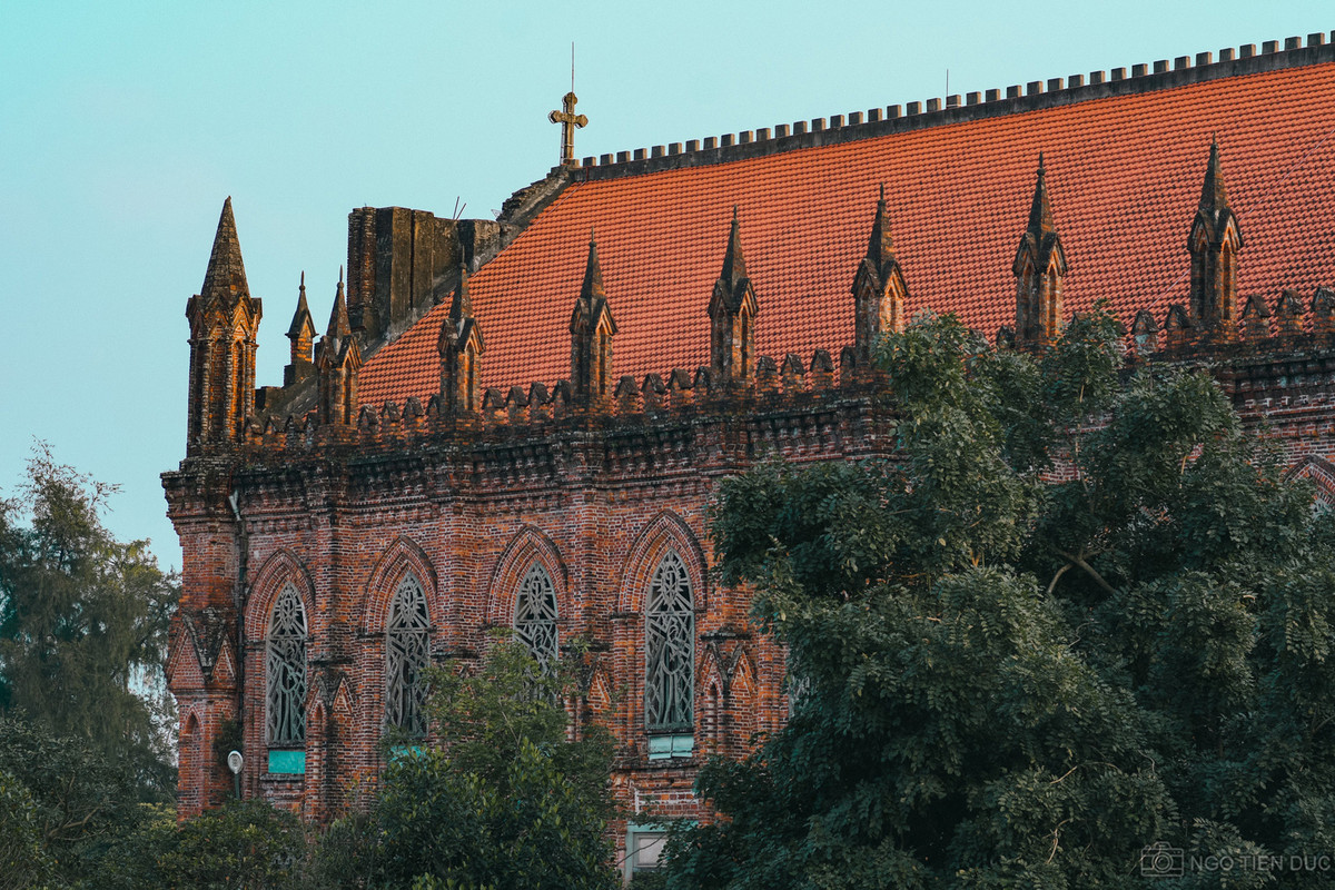 Bên ngoài nhà thờ xây bằng gạch mộc không tô vữa, tạo nên sắc đỏ trầm nổi bật giữa không gian. Khi xây dựng ngôi nhà thờ này, gạch được đặt làm riêng để tạo điểm nhấn bắt mắt.