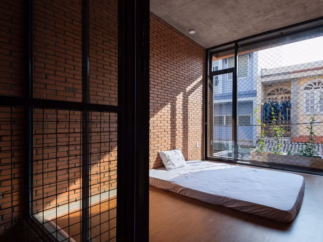 Điểm nhấn đầu tiên gây ấn tượng của công trình là mặt tiền độc đáo, khiến ngôi nhà nổi bật hơn hẳn những công trình xung quanh. Các vật liệu đơn giản, dễ kiếm như gạch mộc, lưới mắt cáo, bê tông trần và kính đã được các kiến trúc sư kết hợp khéo léo mang đến một thiết kế mặt tiền mở, thoáng nhưng vẫn rất kín đáo, riêng tư.