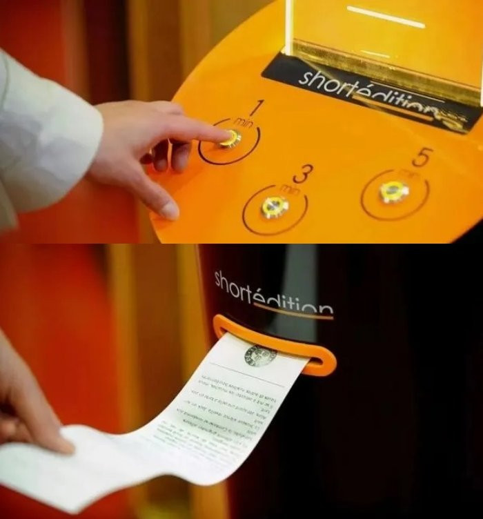 Chiếc máy lạ lùng này được đặt ở ga tàu điện ngầm Canary Wharf (London, Anh Quốc), chuyên cung cấp tiểu thuyết dạng cuộn mini cho hành khách tại đây.