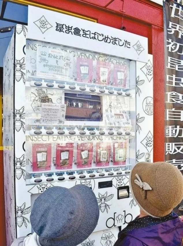 Bạn có thể bắt gặp những chiếc máy bán côn trùng tự động như thế này ở tỉnh Kumamoto (Nhật Bản). Có tới mười mấy loài côn trùng được đặt trong máy để khách mua lựa chọn, trong đó có dế mèn, cào cào, con xén tóc, cà cuống…