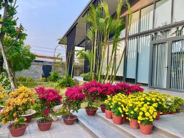 Biệt thự có không gian mở, với nhiều cửa kính cường lực. Phần cửa kính anh dán phim cách nhiệt cản nắng. Bậc thềm gia chủ trang trí bằng nhiều chậu hoa cảnh, còn ngoài vườn trồng cỏ Nhật và các loại hoa dễ chăm.