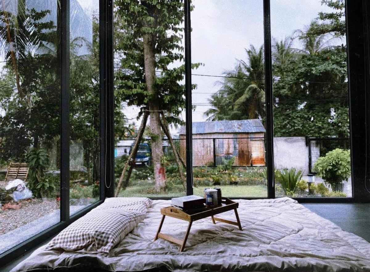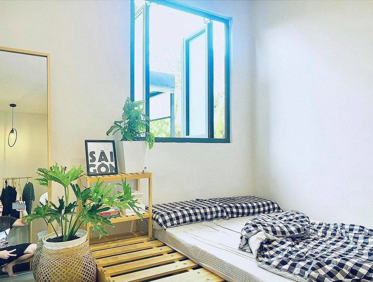 Ngôi nhà có 2 phòng ngủ. Một phòng ngủ nằm trong khu vực xây tường gạch, một phòng ngủ nằm tại khu vực tường kính, hướng nhìn ra vườn giống như đang ở Đà Lạt. Tất cả các phòng ngủ anh Long không làm giường mà dùng tấm gỗ pallet kê chân rồi đặt đệm lên.