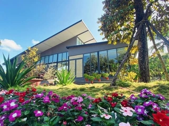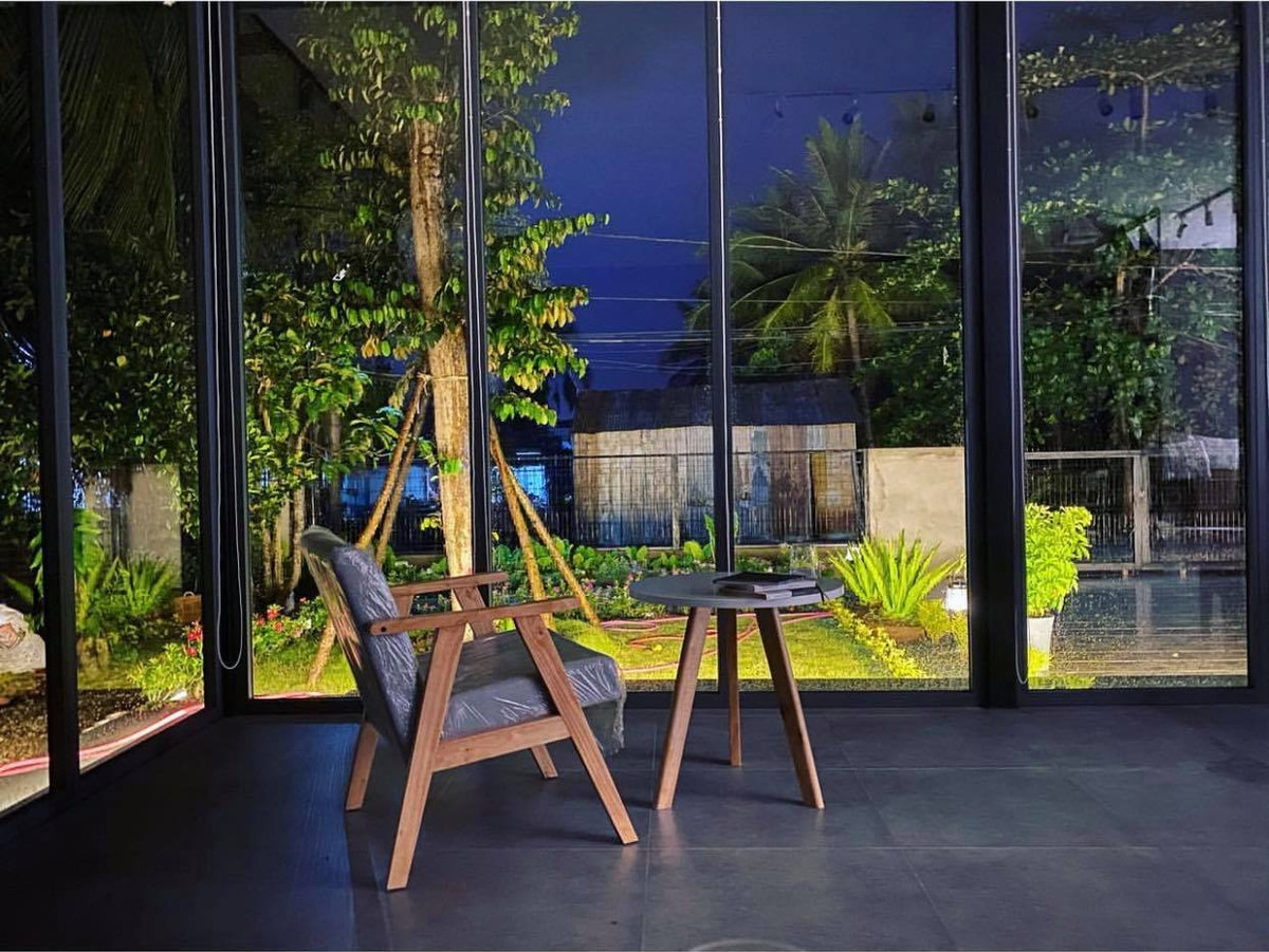 Biệt thự vườn ở huyện Kiên Lương (Kiên Giang) của anh Nguyễn Long xây dựng cuối năm 2019 với tổng diện tích 800m2 được làm phần lớn từ sắt tiền chế và nhôm, xung quanh gắn kính cường lực. Toàn bộ biệt thự là không gian mở, bất cứ góc nào cũng có kính.