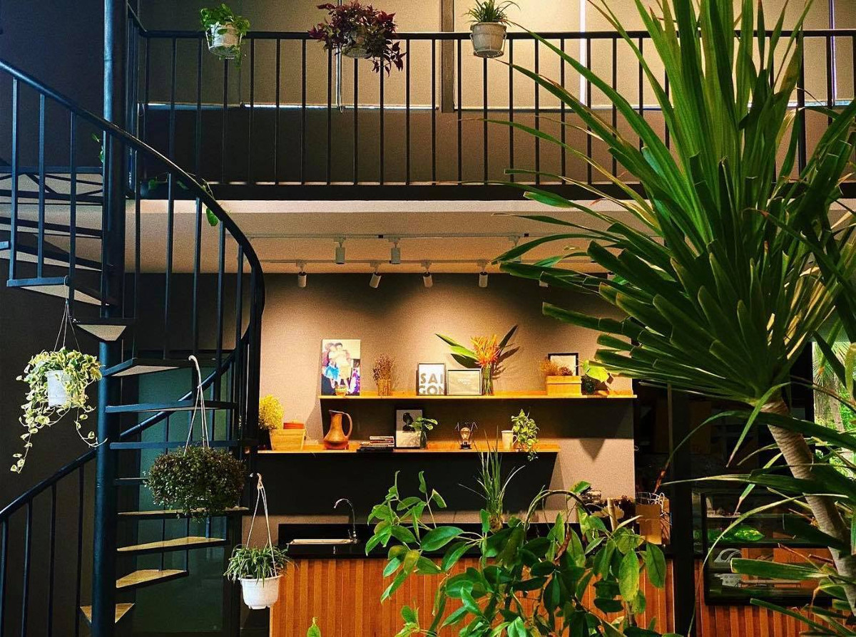 Góc làm việc có vew nhìn ra vườn, còn góc thư giãn cạnh bồn cây xanh. Dọc cầu thang gia chủ trồng thêm nhiều chậu hoa leo, tăng năng lượng tươi mới cho nhà.