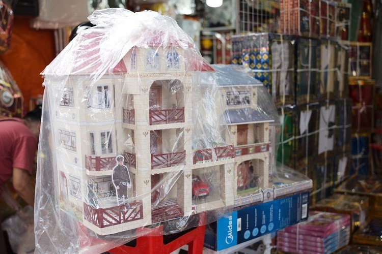 Vừa nâng căn biệt thự bằng giấy cho khách xem, chị Nguyễn Lan, tiểu thương ở đây cho biết, thay vì nhà cao tầng đơn giản thì năm nay có các mẫu biệt thự kèm cả hồ bơi, gara ô tô, xe sang, bảo vệ đi kèm, thậm chí thêm cả chó cảnh với giá từ 200-350 nghìn đồng tuỳ mẫu.