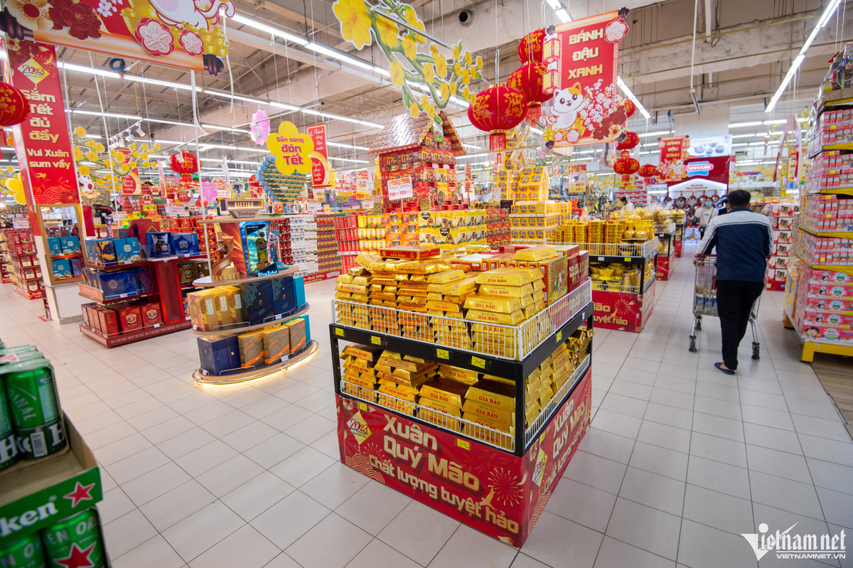 Gần một tuần nay, nhân viên siêu thị tất bật trang trí, bày biện các gian hàng Tết. Hà Nội ước tính tổng giá trị hàng hóa phục vụ tết trên địa bàn thành phố cho khoảng 10,75 triệu người đạt khoảng 39.500 tỷ đồng (tăng 15% so với thực hiện Tết năm 2022).