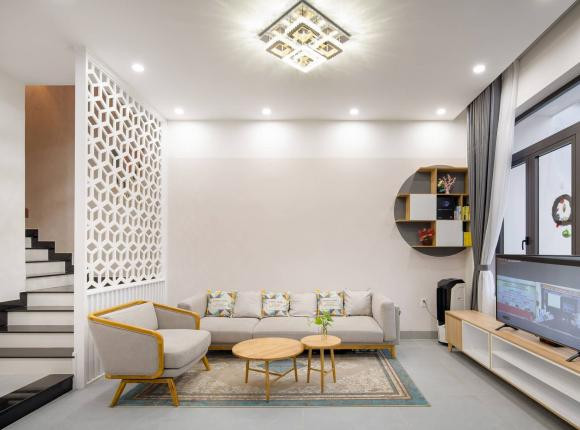 Ngôi nhà 2 tầng gồm không gian sinh hoạt chính và 2 phòng ngủ vừa đủ cho nhu cầu sử dụng. Điểm nhấn là góc sân vườn nhỏ có hồ cá Koi bên cạnh bàn ăn và không gian sân thượng để gia đình tụ tập tán gẫu, ngắm gió mát hoặc tổ chức những bữa tiệc nhỏ.