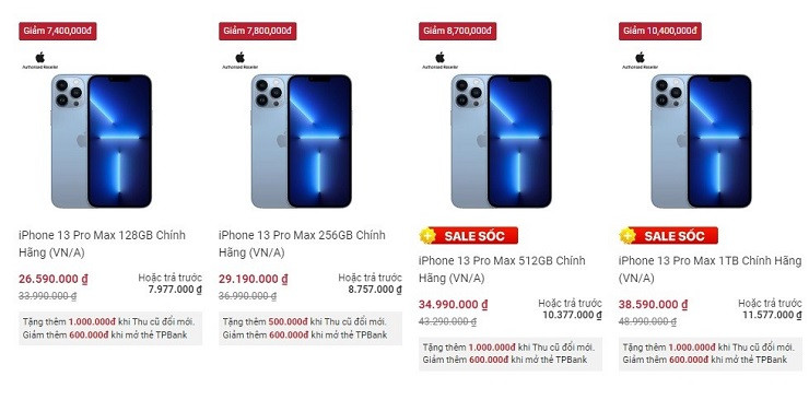 Cụ thể, iPhone 13 Pro Max giảm tới 10,4 triệu đồng, từ 48,9 triệu đồng xuống 38,5 triệu đồng đối với bản 1TB; giảm 8,7 triệu đồng xuống còn 34,9 triệu đồng đối với bản 512GB; giảm 7,8 triệu đồng xuống còn 29,1 triệu đồng đối với bản 256GB và giảm 7,4 triệu đồng, xuống 26,5 triệu đồng đối với bản 128GB.