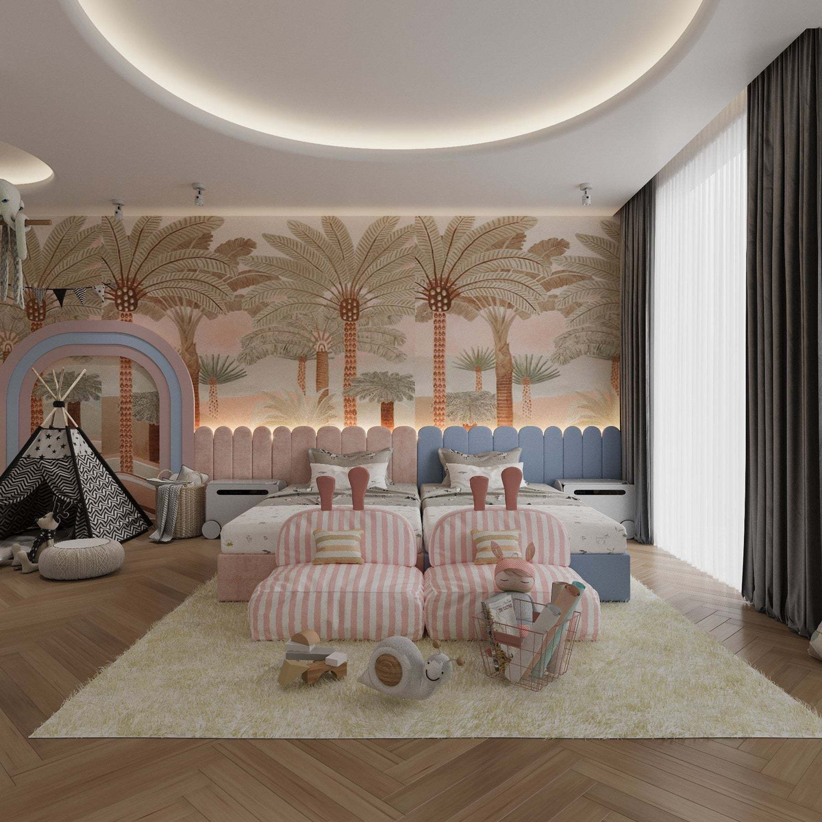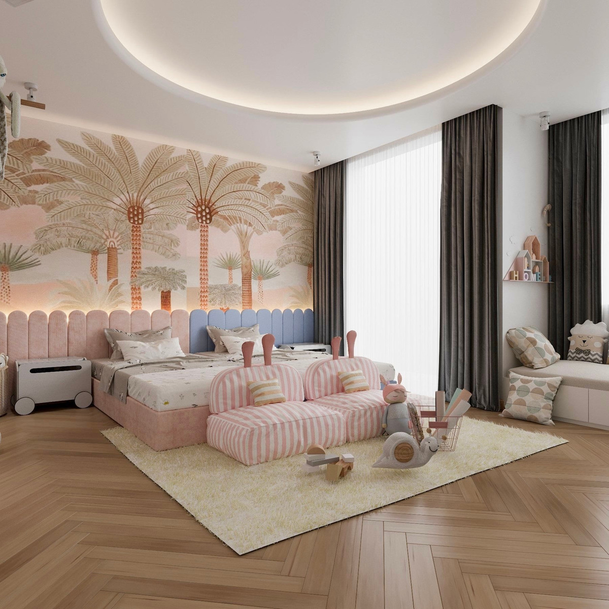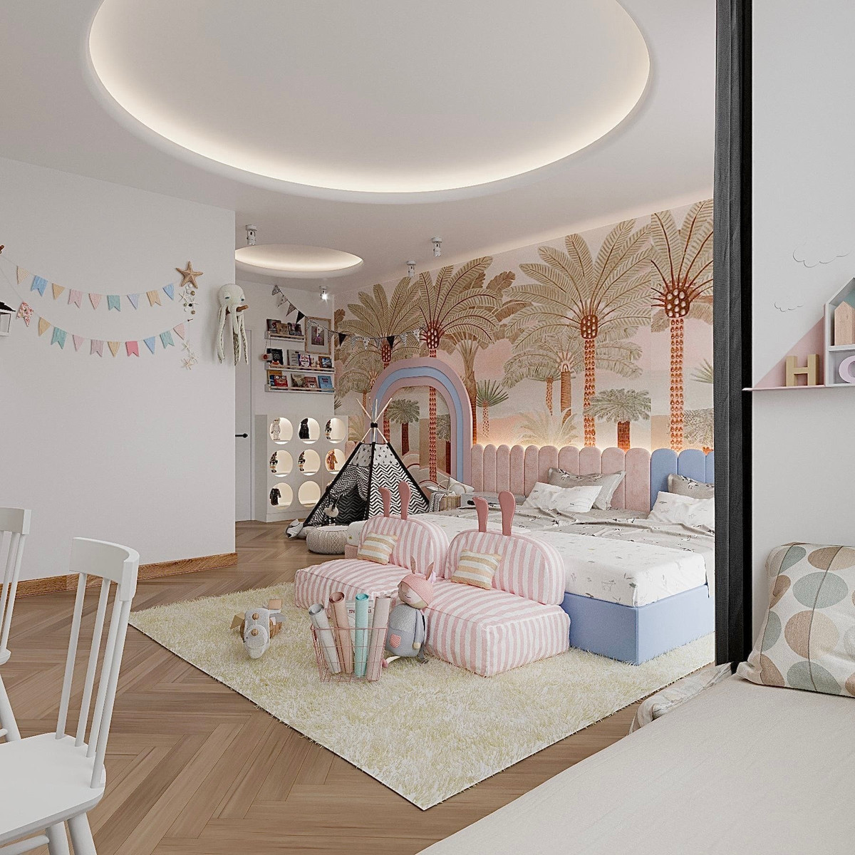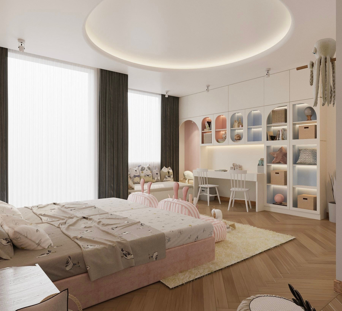 Phòng ngủ cho trẻ em với màu sắc tươi tắn, nhẹ nhàng, chất liệu mềm mại, êm ái.