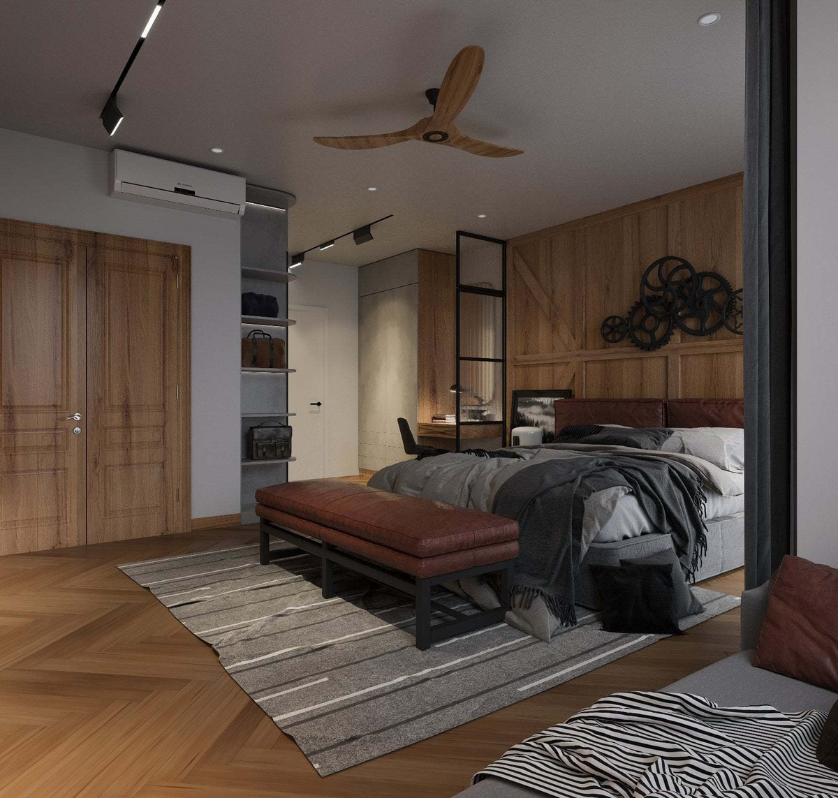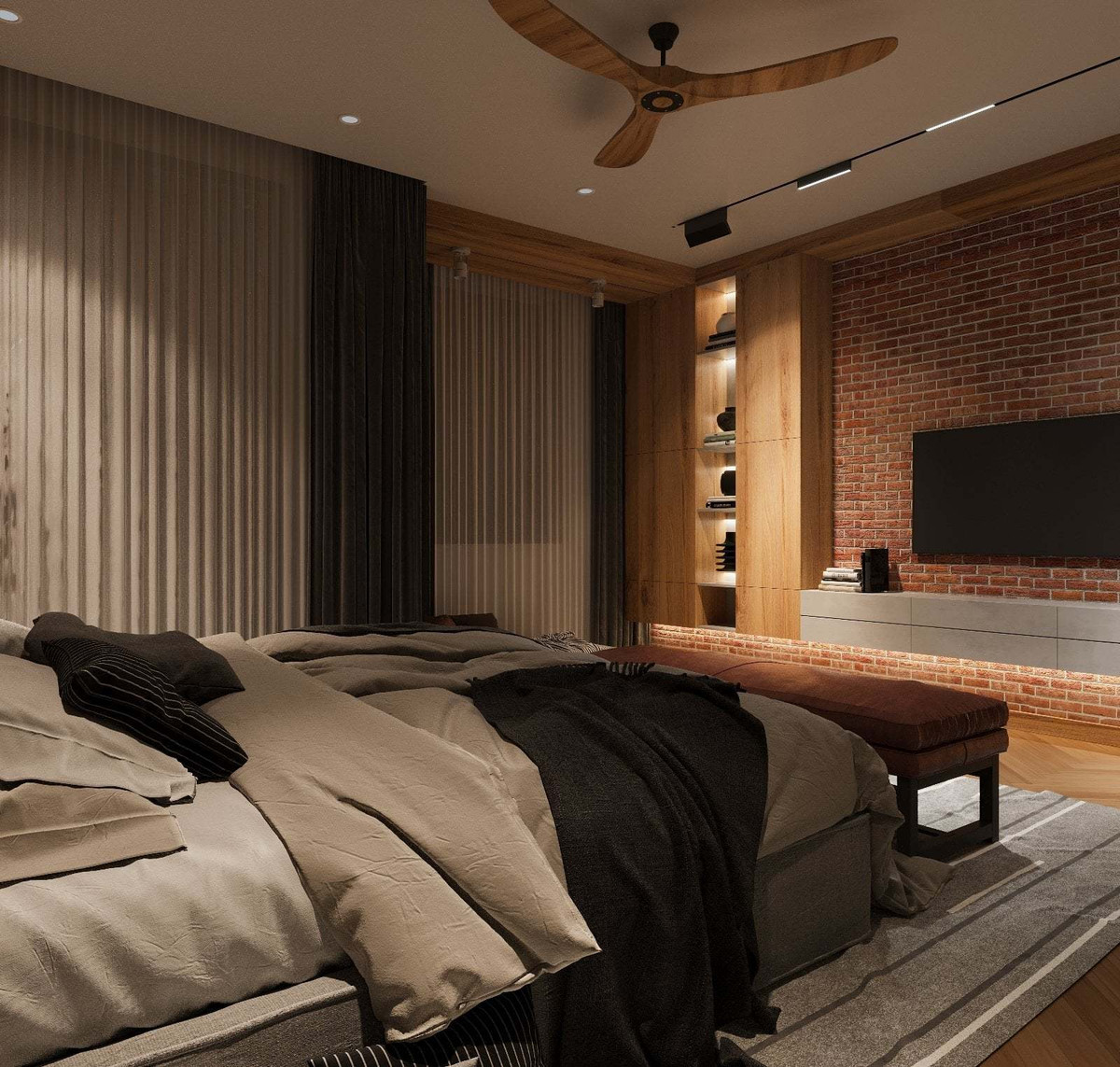 Phòng khách bố trí nhiều lớp ánh sáng. Thay vì sử dụng đèn led và trần thạch cao, kiến trúc sư bố trí hệ đèn ống bơ, thanh ray, đồng thời giữ lại các thanh xà, để tạo điểm nhấn cho trần. Thiết kế này làm ta liên tưởng đến phong cách công nghiệp (Industrial). Ánh sáng là yếu tố rất quan trọng trong trang trí phong cách công nghiệp. Gam màu sử dụng chính cho không gian và đồ nội thất của phong cách này là tông màu trầm, vì vậy ánh sáng mang ý nghĩa quan trọng, nếu thiếu ánh sáng căn phòng sẽ rất tối.