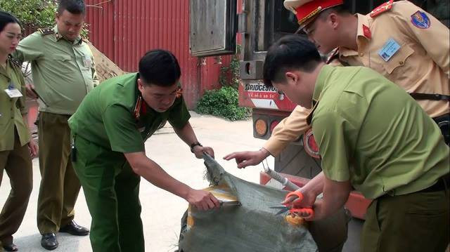Vào khoảng 22h ngày 5/5, tổ công tác của Cục Cảnh sát môi trường đã phối hợp với Phòng tuần tra kiểm soát giao thông đường bộ cao tốc (Cục CSGT - Bộ Công an), Đội Quản lý thị trường số 5 (Chi cục Quản lý thị trường Hà Nội) và Phòng Cảnh sát môi trường (Công an TP Hà Nội) bất ngờ kiểm tra xe ô tô container BKS 60C-05710 kéo theo thùng đông lạnh BKS 60C-00219 đang di chuyển trên đường cao tốc Pháp Vân- Cầu Giẽ.