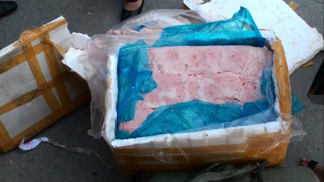 Hơn 11 tấn nầm lợn đông lạnh không rõ nguồn gốc đang được vận chuyển đi tiêu thụ thì bị lực lượng chức năng thu giữ và tiêu hủy.