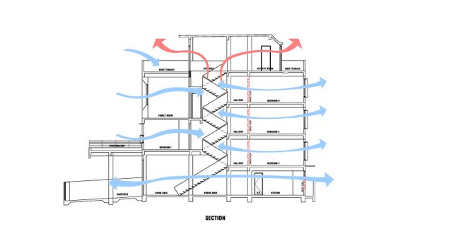 Để giải quyết bài toán thông gió cho nhà phố, nhóm thiết kế đã bố trí một cầu thang kiểu Kirigami ở ngay vị trí trung tâm căn nhà. Lúc này, luồng gió mát được luân chuyển dễ dàng theo trục ngang, đồng thời luồng gió nóng sẽ thoát ra ngoài theo trục đứng của cầu thang.