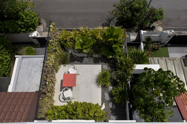Căn nhà cũng chú trọng thiết kế để đưa mảng xanh vào bên trong nhà. Một khu vườn nhỏ được bố trí ở tầng ba, kết hợp với những mảng kính lớn, làm xóa nhòa ranh giới giữa con người và thiên nhiên. Căn nhà tràn ngập gió mát, ánh sáng và cây lá tự nhiên này đích thực là chốn cư ngụ như gia chủ hằng mong muốn.