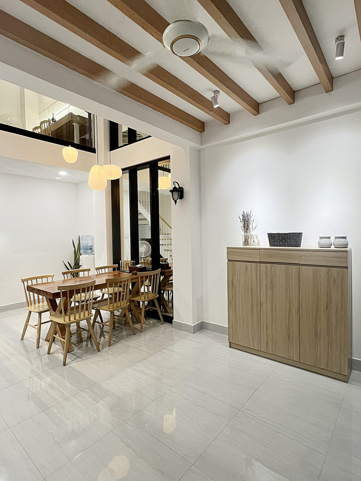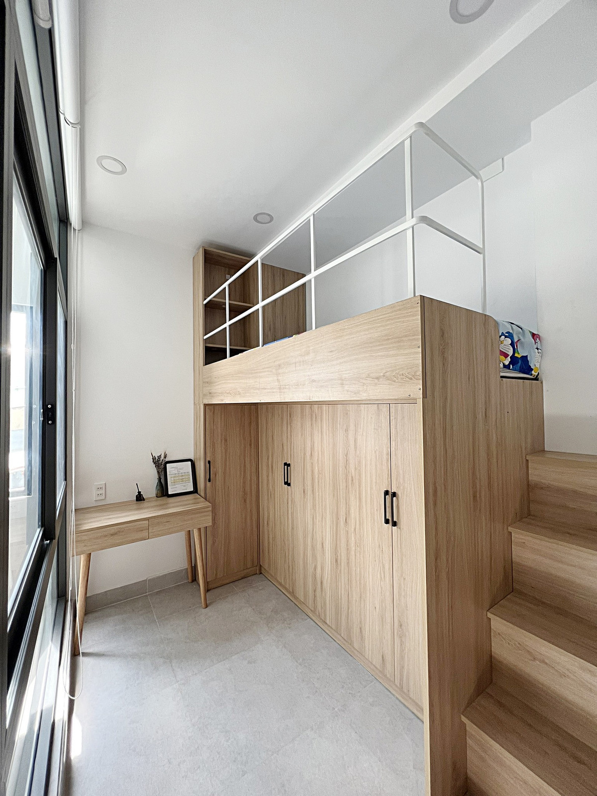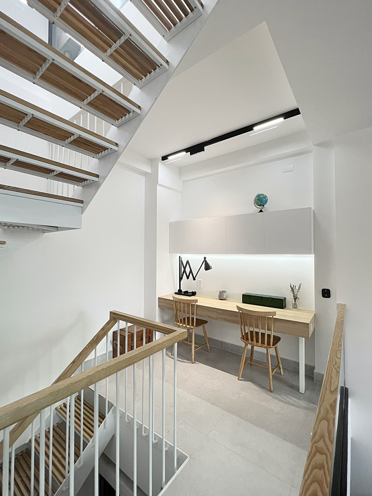 Cầu thang lên tầng 2 với mặt bậc gỗ sồi có chi phí khoảng 1,7 triệu đồng/m2.