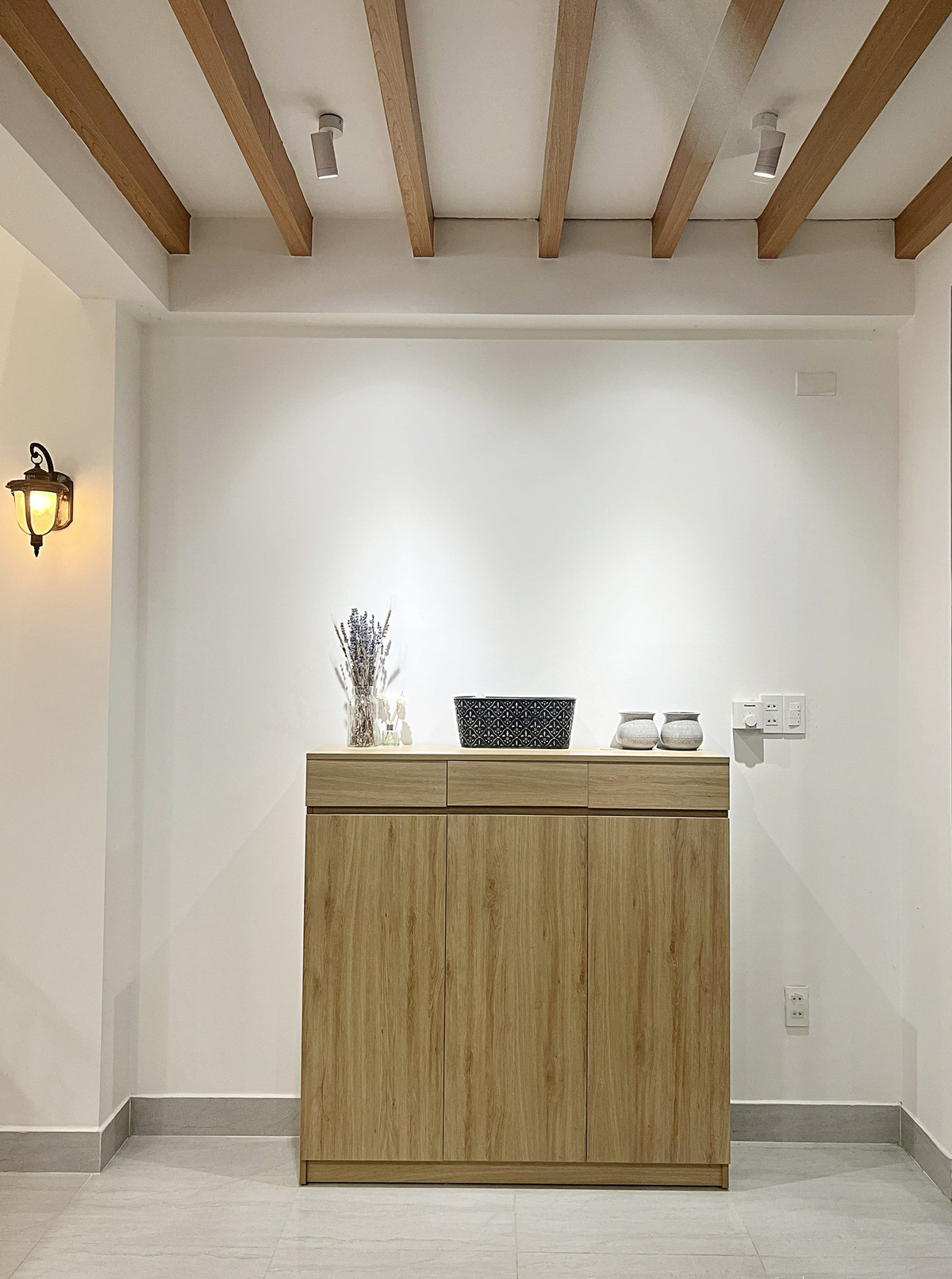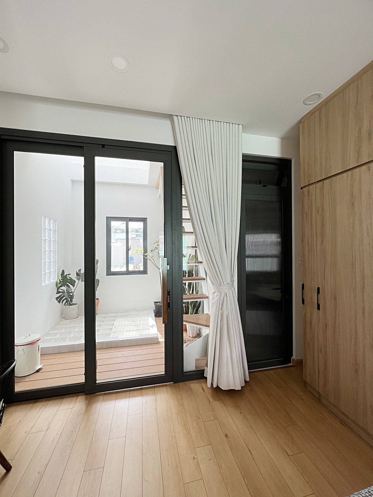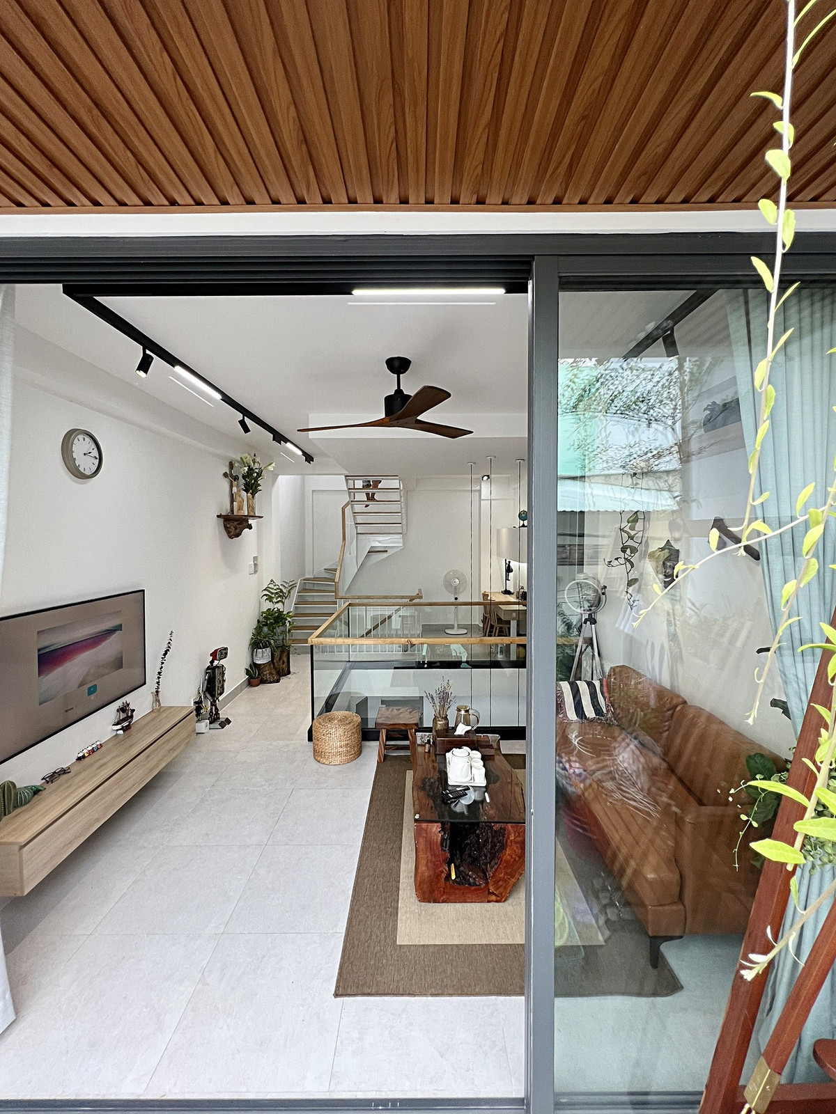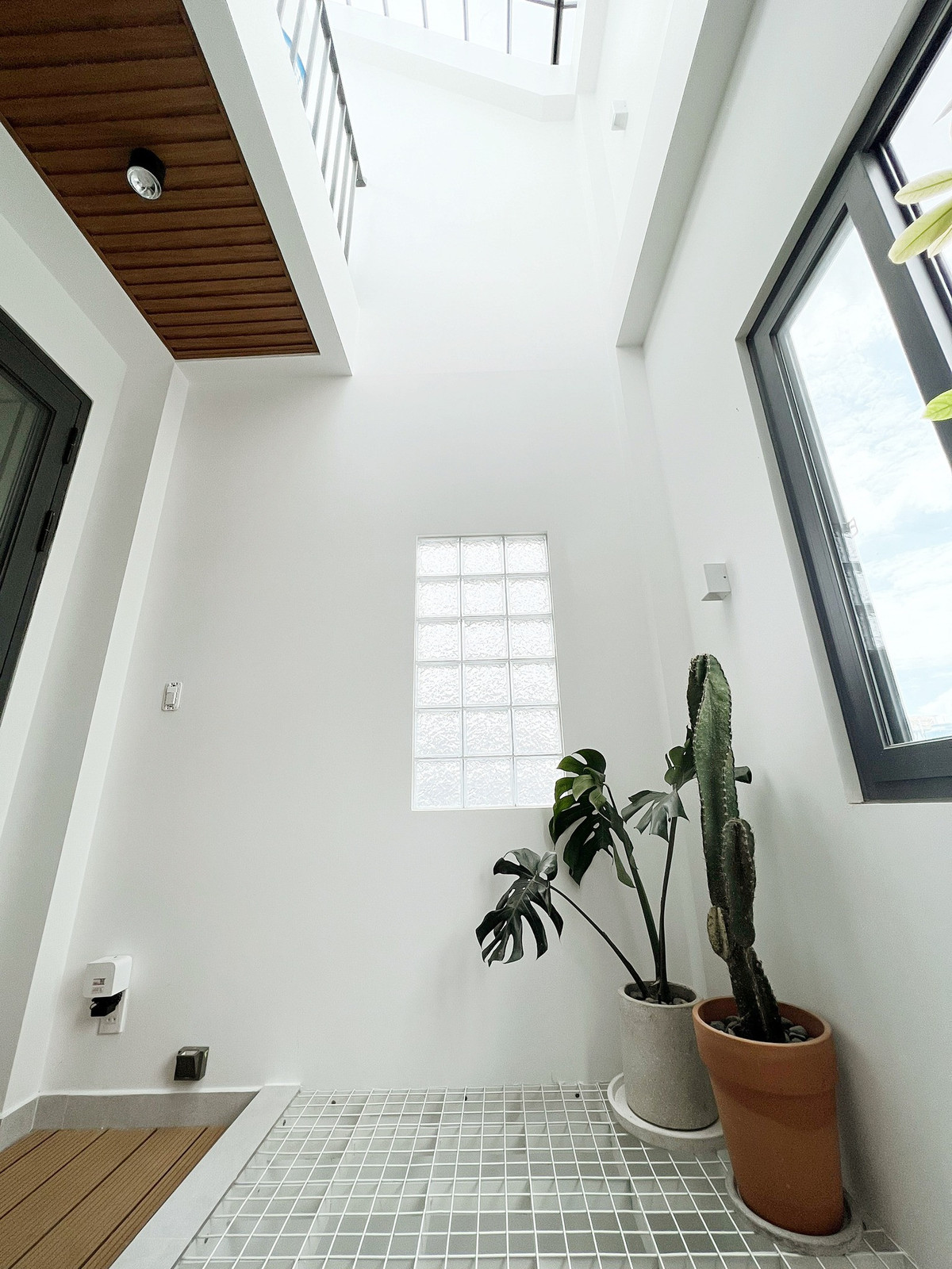Cầu thang lên tầng 2 với mặt bậc gỗ sồi có chi phí khoảng 1,7 triệu đồng/m2.