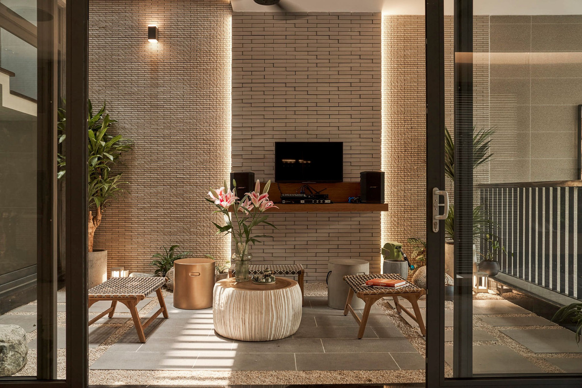 Ngôi nhà do kiến trúc sư Phạm Thanh Truyền cùng cộng sự thiết kế có mặt tiền khá lạ với gạch mộc đỏ xếp chồng, tạo ra những lỗ thoáng hút gió, đồng thời giúp cản nắng phía Tây.