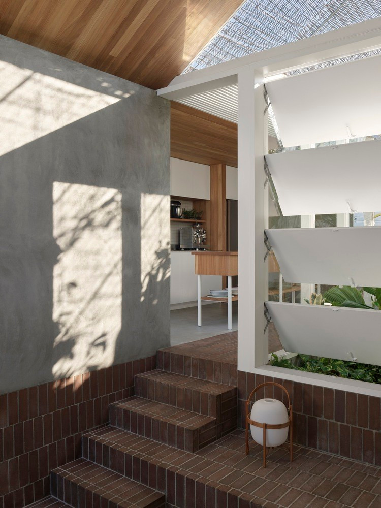 Các bức tường xây thô được hoàn thiện bên trong để bảo vệ các phòng khỏi ánh nắng sáng sớm và chiều muộn.
