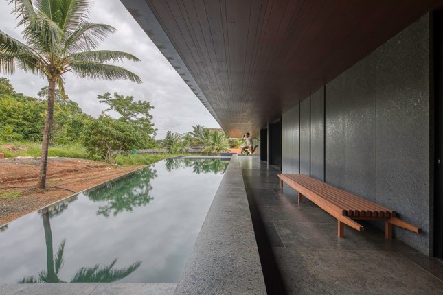 Mái và hiên được thiết kế đua rộng bao trùm lên hành lang như một con đường vòng quanh dãy nhà. Đây là khoảng không gian cho gia chủ dạo chơi, phóng tầm mắt ra rừng dừa phía trước.