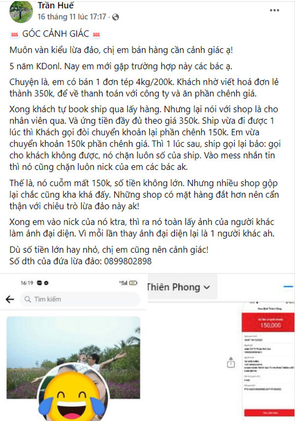 Sau đó, shipper của hãng giao nhận tới lấy quạt điện và đưa cho anh Cường 1,6 triệu đồng. Khi shipper vừa rời khỏi cửa hàng, khách gọi điện thúc giục anh Cường chuyển khoản cho mình số tiền chênh lệch. Anh liền chuyển trả cho khách 1.135.000 đồng vào số tài khoản mà khách cung cấp. Khoảng nửa giờ sau, anh nhận được cuộc gọi từ shipper, thông báo không thể liên hệ được cho người nhận.