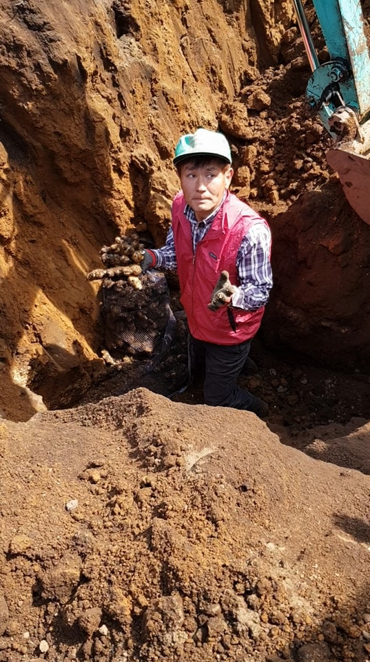 Đào chừng mười phút, khi mà độ sâu đã xuống cỡ 3 mét, ông lão tắt máy, rồi cầm chiếc xẻng nhảy ào xuống hố sâu. Ông đưa tay cạo nhẹ lớp đất rất mịn, trước mắt chúng tôi dần hiện lên những bao gừng trắng. Củ nào củ nấy trắng phau, mây mẩy, nằm gọn gàng trong những chiếc bao tải lưới màu xanh. Chúng tôi chuyền tay nhau cầm những củ gừng. Mắt ai cũng lộ rõ sự ngạc nhiên.