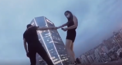 Trên sân thượng của tòa nhà cao tầng, cặp đôi vô tư thể hiện những động tác mạo hiểm khiến người xem thót tim.