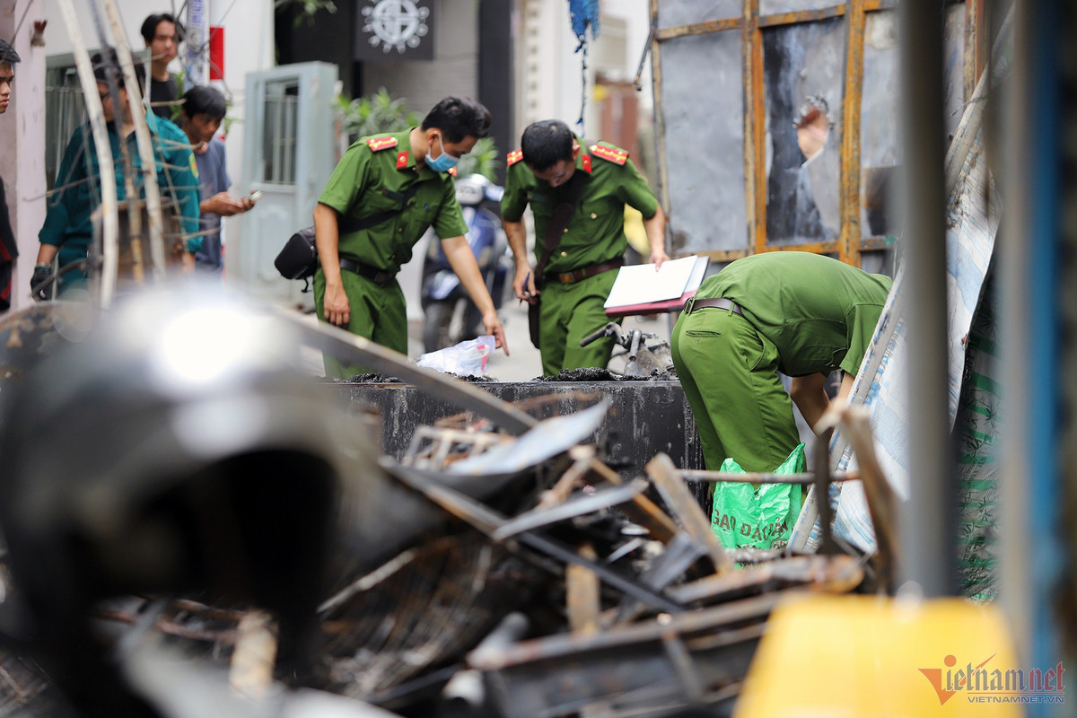 Cảnh sát khám nghiệm, thu các mẫu vật để điều tra nguyên nhân vụ cháy.