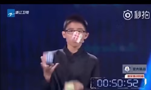 Cậu bé tài năng Que Jianyu, 13 tuổi, đã quyết tâm lập kỷ lục thế giới với màn trình diễn vừa giải 3 khối rubik vừa tung hứng chúng trên tay trong một chương trình giải trí của đài truyền hình Chiết Giang.