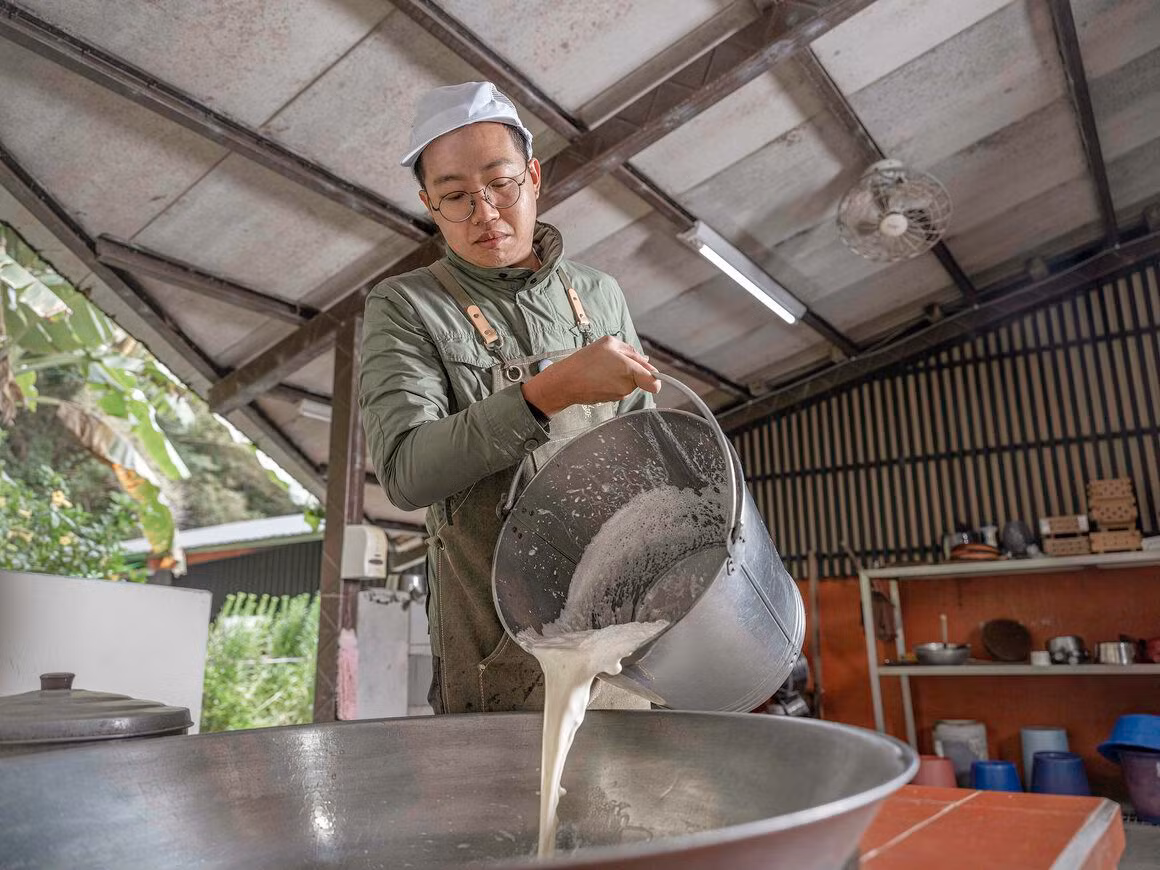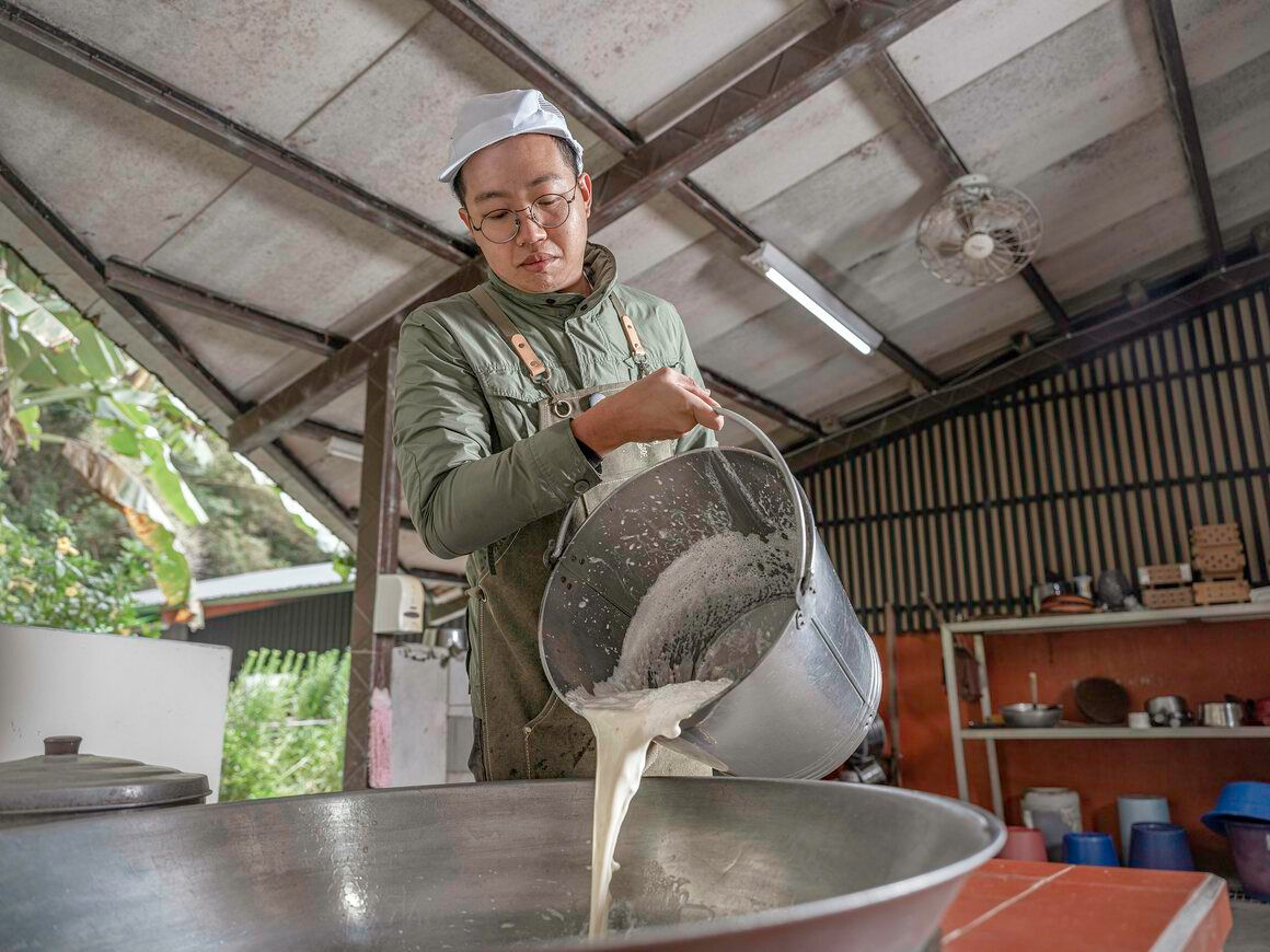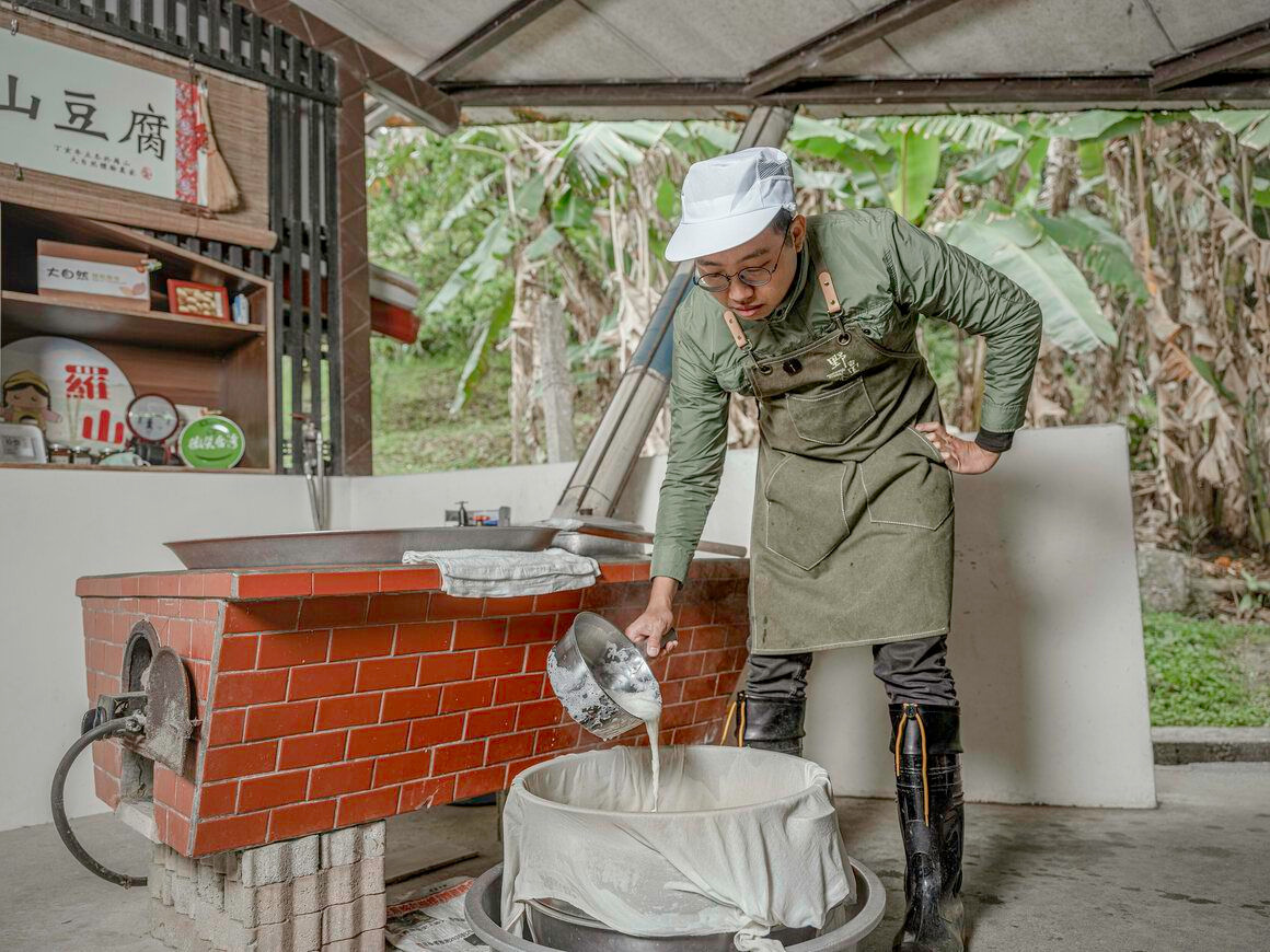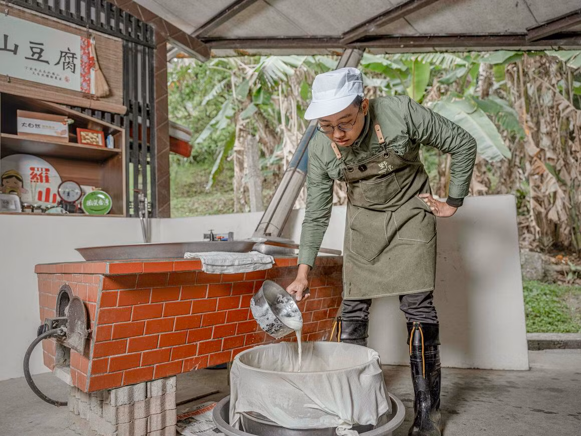 Nhiều hộ dân trong làng mở nhà hàng chuyên các món về đậu phụ, hoặc tổ chức các lớp dạy nấu ăn dựa trên nguyên liệu này. Trong ảnh, ông Lin Yih-Cheng đang ngồi ngoài xưởng làm đậu hữu cơ của mình.
