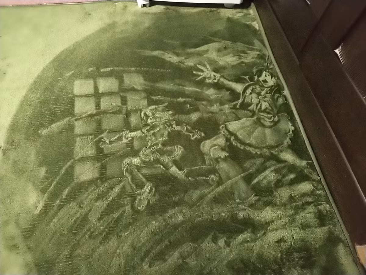 Cô sáng tạo nghệ thuật bằng cách tái tạo gần như chính xác các nhân vật yêu thích của mình trên sàn nhà, bằng chất liệu là những bụi bẩn mà cô dùng máy hút bụi hút được.