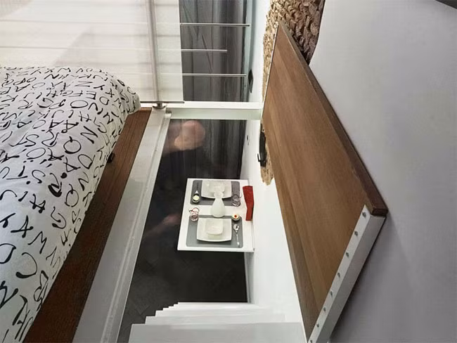 Marco cũng tận dụng các đồ nội thất đa năng, ví dụ cầu thang kiêm tủ đựng đồ, bàn ăn có thể gấp gọn hay giường ngủ có thể “biến hình” thành ghế sofa để tiết kiệm diện tích một cách tối đa.