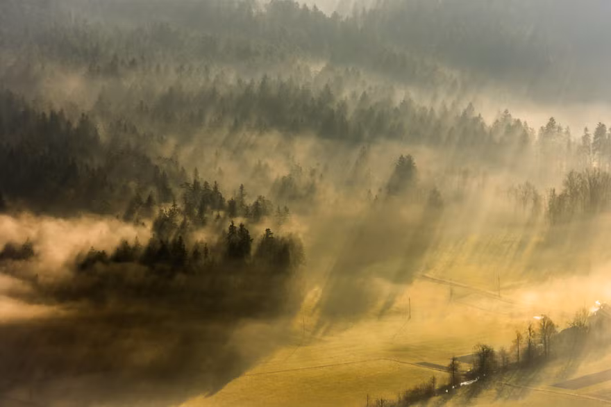 Sẽ không quá lời khi miêu tả những tia nắng mặt trời đẹp như thứ ánh sáng từ thiên đường. Xuyên qua màn sương mỏng, những tia nắng khiến cả bầu trời ở Slovenia đẹp như chốn tiên cảnh.