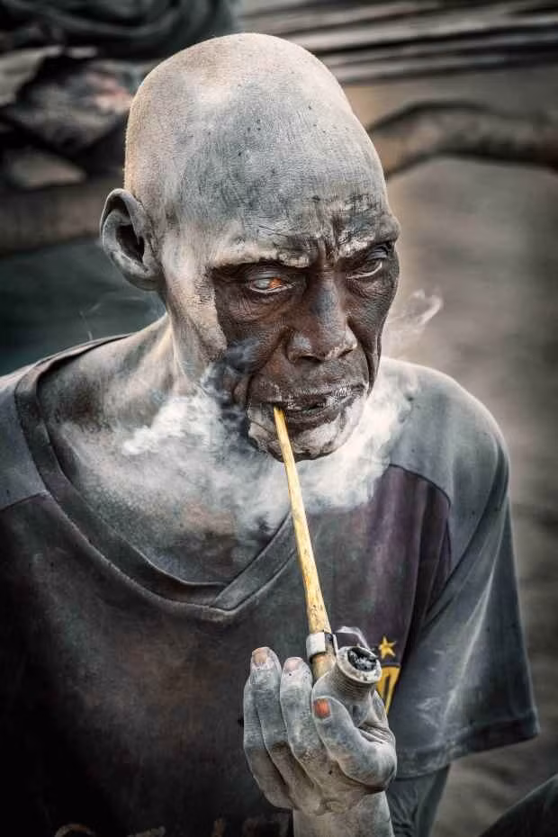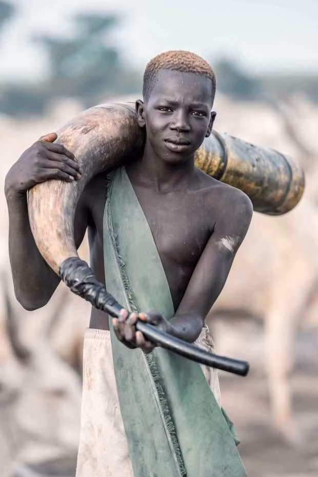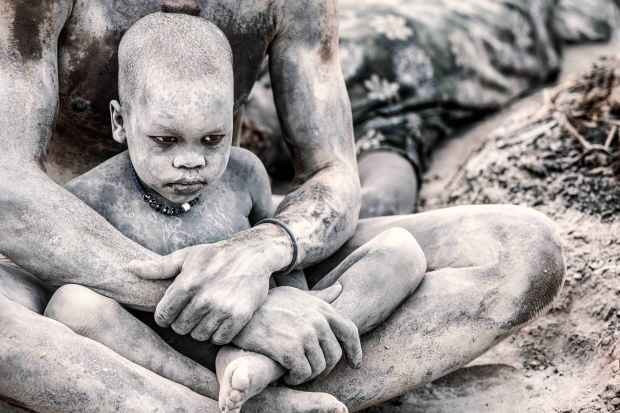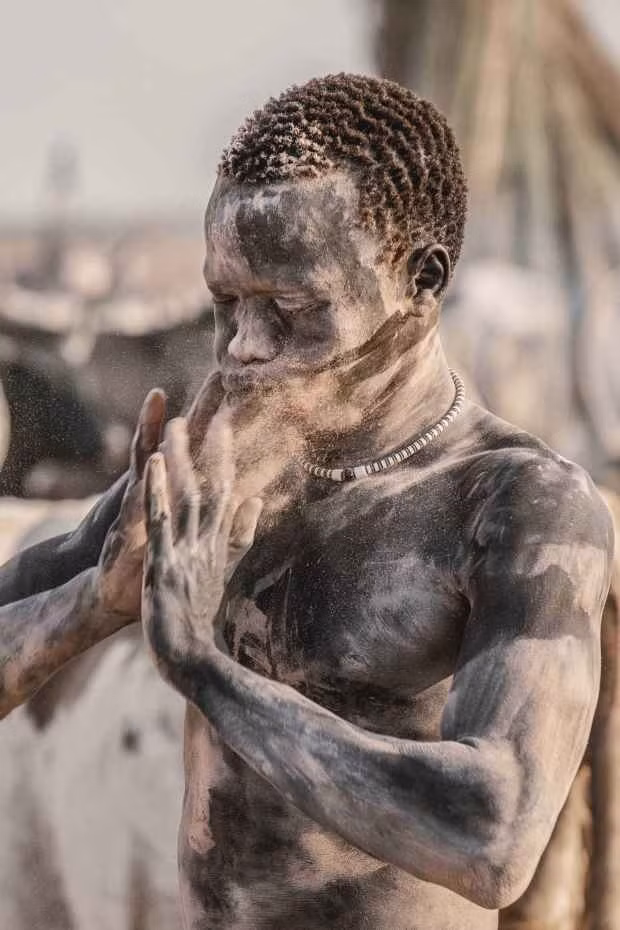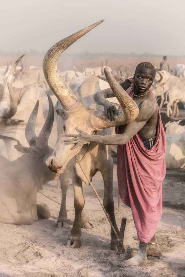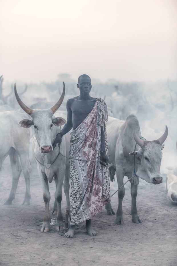 Qua ống kính của nhiếp ảnh gia Trevor Cole đến từ Londonderry, Bắc Ireland, một cậu bé thuộc bộ tộc Mundari ở Nam Sudan phủ đầy tro đốt từ phân bò Ankole Watusi lên người mình, trong khi một chàng trai trẻ trải đều phân trên mặt đất, một người khác đang dùng nước tiểu bò tắm ướt người. Cư dân vùng này chủ yếu chăn bò Ankole Watusi, khi trưởng thành, cặp sừng của giống bò này có thể dài đến 1,8 m.
