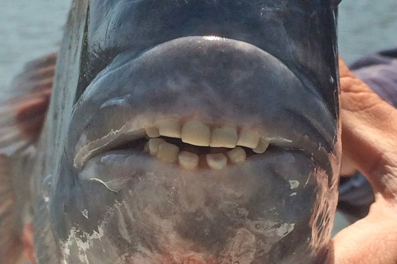 | Bà Pamela với con cá đầu cừu bắt được. |