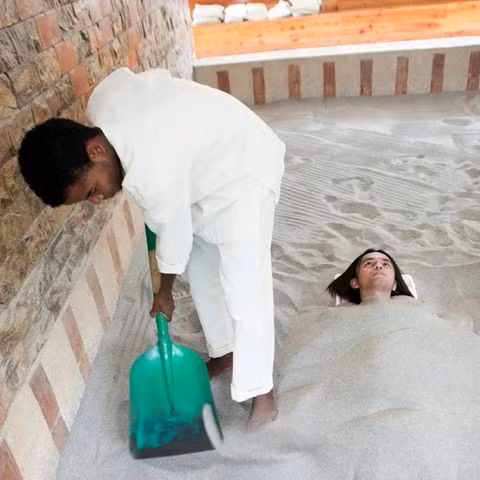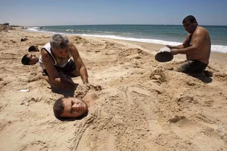 Chôn mình trong cát ở Ai Cập. Người dân địa phương tin rằng nếu chôn mình trong cát như vậy, nhất là vào thời điểm nóng nhất trong ngày, sẽ có hiệu quả chữa trị các chứng bệnh về khớp và chứng liệt dương.