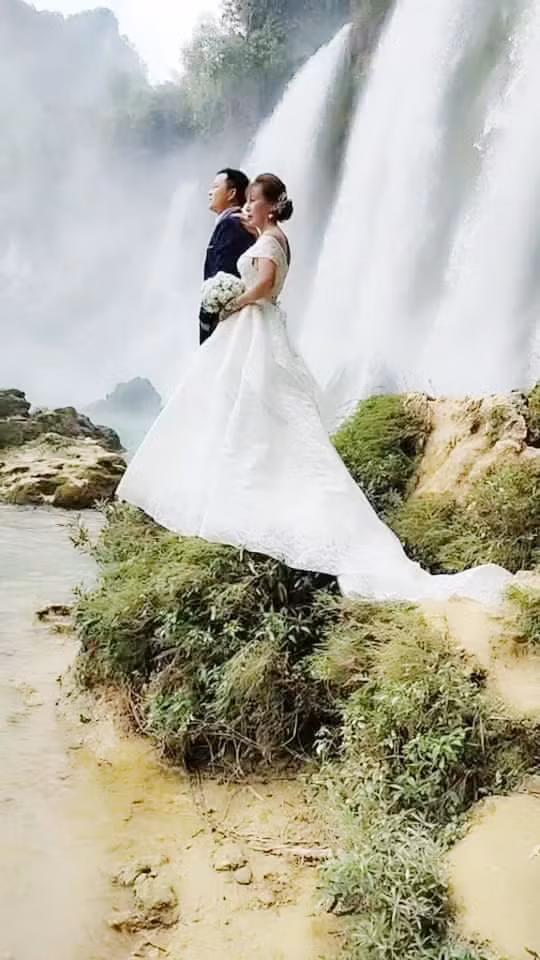 Địa điểm được cô dâu Thu Sao - Hoa Cương chọn để chụp ảnh kỷ niệm là Thác Bản Giốc, một địa danh khá nổi tiếng ở Cao Bằng.