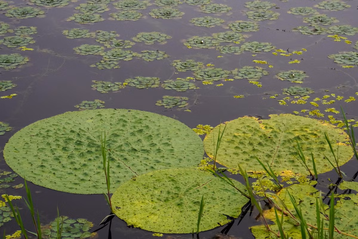 Những chiếc lá khổng lồ nổi trên mặt nước, có thể đạt đường kính hơn một mét, giống như những “tấm khiên” xanh với lớp gai phòng thủ dày đặc, khiến bất kỳ sinh vật nào cũng phải dè chừng.
