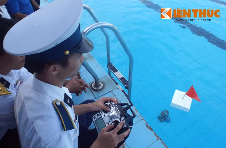 Bắt đầu bài thi dưới nước, các phao cắm cờ đỏ là bia bắn cho các tàu chiến mặt nước.