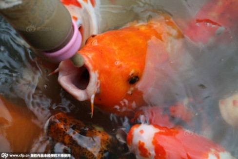 Hình ảnh những con cá bú bình sữa ở công viên tại Hợp Phì, tỉnh An Huy, Trung Quốc khiến người xem thích thú.