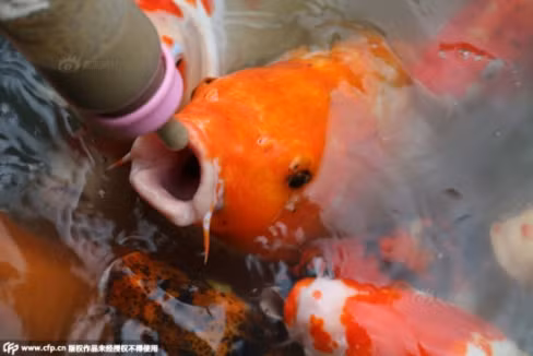 Những chú cá vàng có vẻ thích ăn bằng hình thức "bú bình" này hơn là thức ăn được rải xuống hồ.