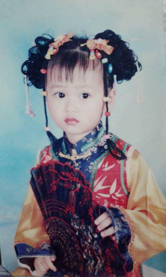 "Lúc mình 2 tuổi, chụp hình cách cách, a ca... là mốt. Mẹ bảo ai cũng thích như vậy nên cũng cho con đi chụp. Mình không chịu, còn khóc quá trời. Nhớ là đến studio, người ta làm hết từ trang điểm, tóc tai cho đến quần áo, rồi kiêm luôn dỗ trẻ. Giờ nhìn mấy tấm hình mặt mũi bí xị hài không chịu nổi", cô gái 21 tuổi kể với Zing.vn.