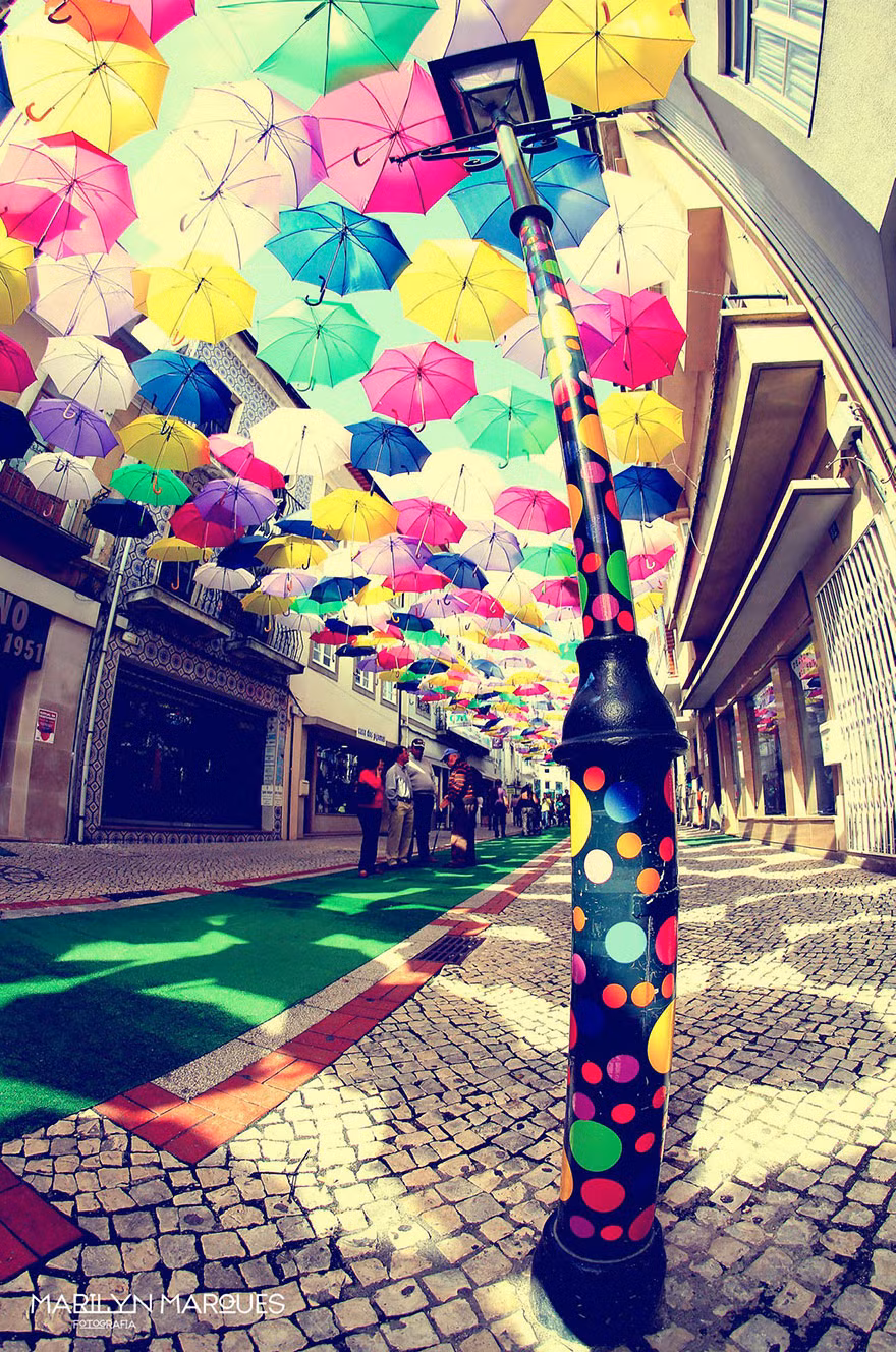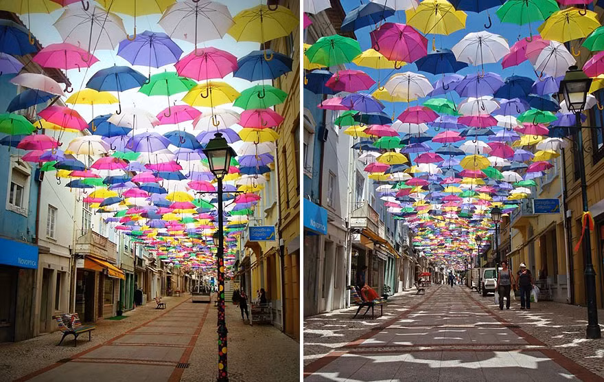 Đây là hoạt động của một phần của lễ hội nghệ thuật Ágitagueda, hàng trăm chiếc ô đủ màu sắc rực rỡ được treo trên các lối đi trong các đường phố của Águeda, một đô thị ở Bồ Đào Nha.
