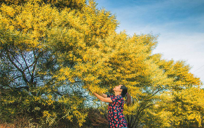 Những cây keo lá tràm không quá cao, bông hoa nhỏ, dạng bông đuôi sóc có màu vàng bóng, điều đặc biệt là mỗi cây có hàng ngàn cách hoa tỏa nắng khác nhau.