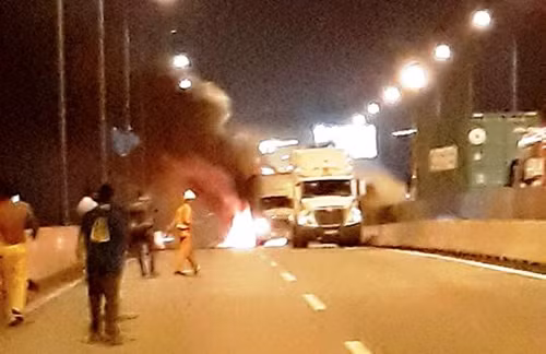 | Hiện trường xe khách 16 chỗ tông xe đầu kéo container rồi bốc cháy dữ dội trên cao tốc HLD. |