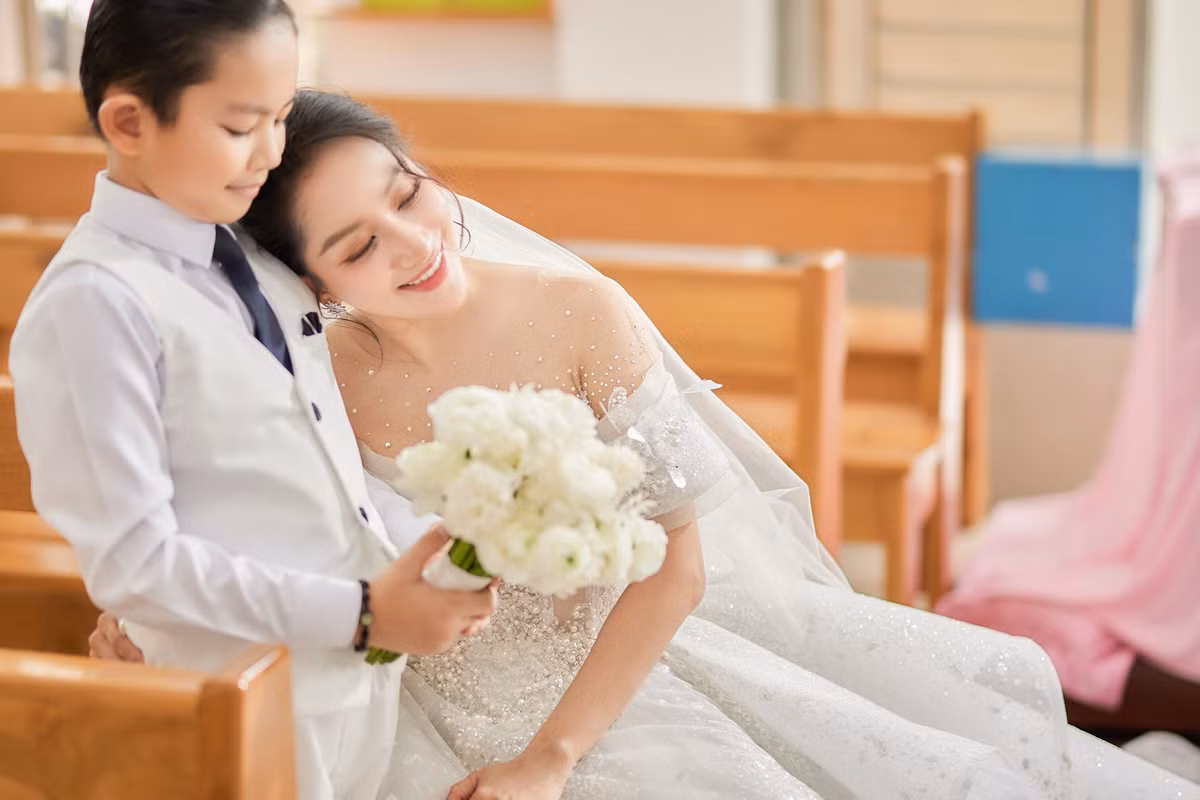 Khoảnh khắc hạnh phúc của Khánh Thi và con gái trong hôn lễ tại nhà thờ.