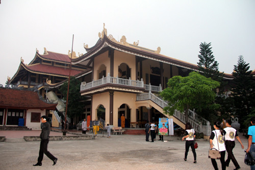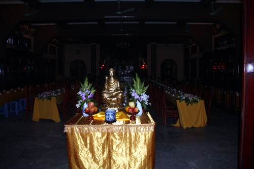 Khoảng 7h, lễ dâng hương Đại tướng sẽ chính thức bắt đầu tại Thiền viện Sùng Phúc. Ngay từ lúc nay, tiếng chuông chùa đã ngân vang. Trong ảnh: Giảng đường của Thiền viện tranh trí long trọng đón lễ dân hương Đại tướng.